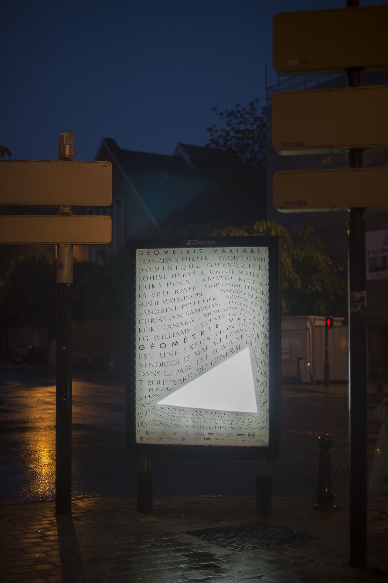 GÉOMÉTRIE VARIABLE, 2013 Super Window Project Domaine Les Crayères, Reims en collaboration avec Clap Clap Club Le projet consiste en la réalisation d’une série de 55 affiches destinées à annoncer, dans l’espace public de la ville de Reims, une exposition d’art contemporain. Le titre de l’exposition a été envisagé comme injonction à travailler sur la thématique de la variable. La perforation d’un triangle, polygone minimal pour créer un trou, est réitérée aléatoirement sur chaque affiche. Les limites de la feuille sont ainsi reconfigurées, et impliquent que le bloc de texte informatif se justifie sans cesse de manière différente. D’une affiche à l’autre, les variations sont infimes ou totalement exagérées. La lisibilité peut être mise en péril, mais la familiarité émanant de la gamme d’affiches permettra de rassembler l’ensemble des informations par un parcours dans la ville. Photos: Aurélie Petrél |